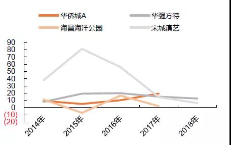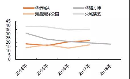 宋城演藝凈利潤規(guī)模僅次于華僑城,2014-2016年由于異地復(fù)制的新項(xiàng)目開業(yè),以及收購六間房,營收和凈利潤增速遠(yuǎn)高于其他主題公園集團(tuán)。宋城演藝的主題公園建設(shè)所需投入較低,每個(gè)主題公園大約只需5-10億元,遠(yuǎn)低于其他主題公園幾十億甚至上百億的投入,因此資產(chǎn)負(fù)債率很低,不到20%。宋城演藝主題公園盈利能力較強(qiáng),ROE16%左右,高于行業(yè)平均水平,且保持穩(wěn)步提升。