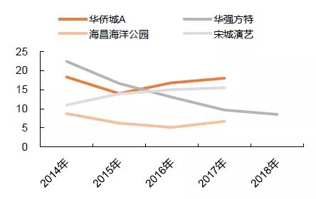 華強(qiáng)方特營業(yè)收入近年來穩(wěn)步提升,增速維持在10%以上,但新項(xiàng)目投產(chǎn)初期尚未實(shí)現(xiàn)盈利,歸母凈利潤在經(jīng)歷了2014、2015兩年的減少之后,又迎來5%左右的增速。華強(qiáng)方特毛利率高于其他公司,但由于不斷攀升的銷售費(fèi)用,凈利率持續(xù)下降。公司走輕資產(chǎn)化方案,資產(chǎn)負(fù)債率逐年下降。由于華強(qiáng)方特業(yè)務(wù)擴(kuò)張較快,新項(xiàng)目盈利能力不如人意,因此ROE持續(xù)下降。