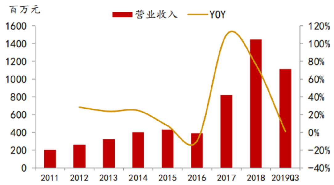 2018年,公司實現(xiàn)營業(yè)收入14.46億元,同比增長76.23%,實現(xiàn)歸母凈利潤2.84億元,同比增長239.37%。其中電子化學(xué)品占公司總營收的64.9%,是公司最主要的收入來源。