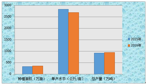 圖1 2015年、2016年中國生姜種植面積、單產水平及總產量
