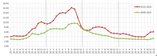 2016年國內生姜價格平多漲少,由于近三年生姜供應持續(xù)向好,整體均價為近三年低位。截至2016年12月,批發(fā)市場均價4.75元/公斤,較2015年下滑2.11元/公斤,跌幅30.79%。