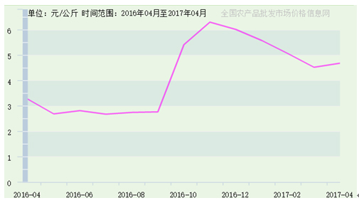據全國農產品批發(fā)市場價格信息網提供數據,2016年4月至2017年4月,寧夏生姜價格趨勢與我國生姜價格總趨勢保持一致,如圖5所示。區(qū)內生姜價格最高價出現在2016年12月15日,為7.2元/公斤,由吳忠市鑫鮮農副產品市場有限公司上報;市場最低價出現在2016年6月15日,為2.3元/公斤,由銀川北環(huán)批發(fā)市場上報。