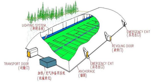氣膜體育館內(nèi)除了需要配備一套智能化的加熱、充氣以及備用設(shè)備之外,還需要具備完整的照明系統(tǒng)以及門禁系統(tǒng)。其中的運(yùn)輸門主要供相關(guān)的工作人員使用,最主要的作用是運(yùn)輸體育場(chǎng)館內(nèi)所需要的大型物件;旋轉(zhuǎn)門則是為運(yùn)動(dòng)人員以及工作人員日常進(jìn)出提供方便。為了防止發(fā)生意外事故,一般在氣膜體育館內(nèi)還會(huì)專門開設(shè)幾個(gè)應(yīng)急出口。