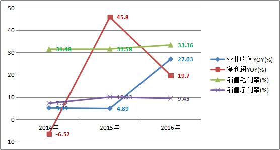 2016年,約頓的總資產(chǎn)增長(zhǎng)率、凈利潤(rùn)增長(zhǎng)率分別為69.61%、19.71%,兩指標(biāo)較2015年均有不同程度的下降;營業(yè)收入增長(zhǎng)率為27.04%,較2015年有所上升。