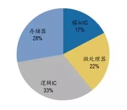 從進(jìn)口集成電路產(chǎn)品的類別來看,微處理器/控制器進(jìn)口額位列榜首,2014年價(jià)值高達(dá)1052.2億美元,占比48.33%;接著是半導(dǎo)體存儲器,2014年價(jià)值達(dá)542.8億美元,占比24.93%,之后是放大器,占比4.13%。