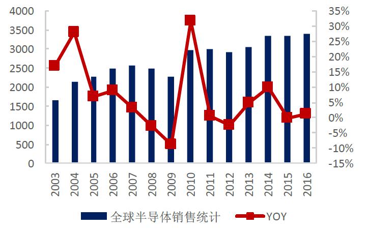 隨著全球經(jīng)濟(jì)的逐步復(fù)蘇,PC、手機(jī)、液晶電視等消費(fèi)類電子產(chǎn)品需求不斷增加,同時(shí)在以物聯(lián)網(wǎng)、可穿戴設(shè)備、云計(jì)算、大數(shù)據(jù)、新能源、醫(yī)療電子和安防電子等為主的新興應(yīng)用領(lǐng)域強(qiáng)勁需求的帶動下,半導(dǎo)體銷售市場規(guī)模穩(wěn)定增長,預(yù)計(jì)2017年全球集成電路市場規(guī)模增長至3465億美元。