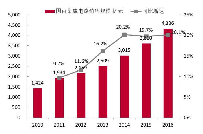 2016年中國集成電路產(chǎn)業(yè)繼續(xù)高速增長的勢頭,從半導(dǎo)體行業(yè)協(xié)會的2017年最新統(tǒng)計(jì),2016年中國集成電路產(chǎn)業(yè)銷售額高達(dá)4335.5億元,比2015年增長20.1%。