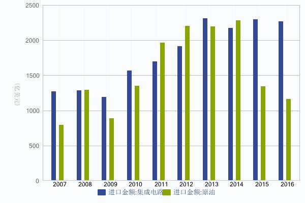 中國集成電路的進(jìn)口持續(xù)維持高位。2016年,集成電路進(jìn)口額達(dá)到2270.7億美元,比上年下降了1.2%,但是也連續(xù)四年超過了2000億美元,是價(jià)值最高的進(jìn)口商品。同期出口集成電路613.8億美元,下降11.1%,貿(mào)易逆差高達(dá)1657億美元。預(yù)計(jì)未來幾年,集成電路進(jìn)口額仍將維持高位。