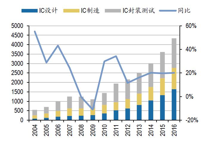 芯片制造業(yè)繼續(xù)保持高速增長態(tài)勢,增速位列三業(yè)最高。設(shè)計(jì)業(yè)總規(guī)模第一次超過封裝測試業(yè),位列第一。據(jù)中半?yún)f(xié)數(shù)據(jù),2015~2016年,中國集成電路芯片設(shè)計(jì)業(yè)年增長率24.1%,封裝測試業(yè)年增長率13.03%,芯片制造業(yè)年增長率25.1%。