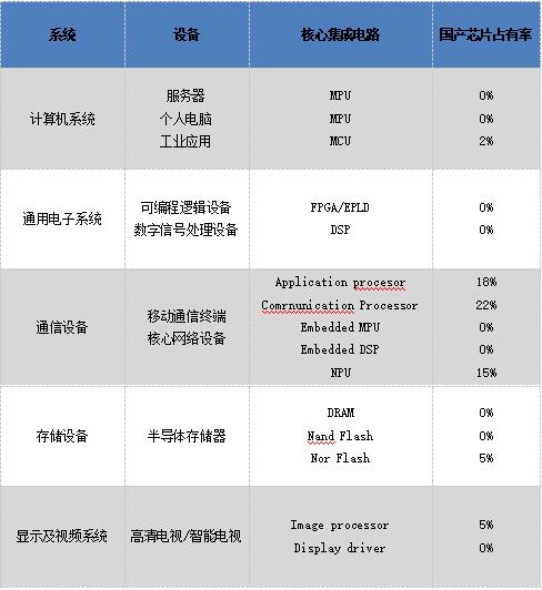 表中計(jì)算機(jī)系統(tǒng)中的MPU、通用電子系統(tǒng)中的FPGA/EPLD和DSP、通信裝備中的 Embedded mpu和DSP、存儲設(shè)備中的DRAM和 Nand flash、顯示及視頻系統(tǒng)中的 Display driver,國產(chǎn)芯片占有率都是零這就指出了一個(gè)嚴(yán)峻的問題,我國所需核心芯片主要依賴進(jìn)口。半導(dǎo)體產(chǎn)業(yè)關(guān)系國家經(jīng)濟(jì)和安全命脈,中國半導(dǎo)體從業(yè)者身肩重責(zé),必須為核心芯片國產(chǎn)化不斷努力。