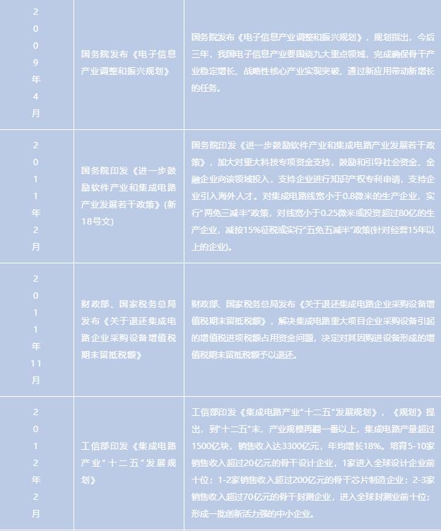 2011年出臺的《國務(wù)院關(guān)于印發(fā)進(jìn)一步鼓勵(lì)軟件產(chǎn)業(yè)和集成電路產(chǎn)業(yè)發(fā)展若干政策的通知》,提出要大力支持軟件和集成電路重大關(guān)鍵技術(shù)的研發(fā),努力實(shí)現(xiàn)關(guān)鍵技術(shù)的整體突破,加快具有自主知識產(chǎn)權(quán)技術(shù)的產(chǎn)業(yè)化和推廣應(yīng)用,重點(diǎn)支持高端芯片、集成電路裝備和工藝技術(shù)、集成電路關(guān)鍵材料、關(guān)鍵應(yīng)用系統(tǒng)的研發(fā)以及重要技術(shù)標(biāo)準(zhǔn)的制訂;在《電子信息制造業(yè)“十二五”發(fā)展規(guī)劃》和《集成電路產(chǎn)業(yè)“十二五”發(fā)展規(guī)劃》中也均提出要著力發(fā)展芯片設(shè)計(jì)業(yè),壯大芯片制造業(yè),開發(fā)髙性能集成電路產(chǎn)品,增強(qiáng)先進(jìn)和特色工藝能力。