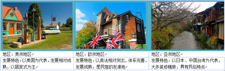 發(fā)展特色:以美國(guó)為代表,發(fā)展相對(duì)成熟,以居家式為主 發(fā)展特色:以英法相對(duì)突出,體系完善,發(fā)展成熟,是民宿的發(fā)源地 發(fā)展特色:以日本、中國(guó)臺(tái)灣為代表,大多裝修精致,具有民俗特點(diǎn)
