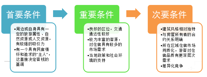 客棧民宿開發(fā)的條件主要可以分為以下三個(gè)層級(jí),在開發(fā)過程中要注意這三類條件的層次,保證首要條件的情況下盡量滿足另外兩個(gè)層級(jí)的條件。