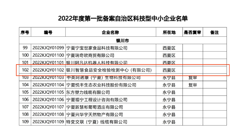 近日,自治區(qū)科技廳發(fā)布了《關(guān)于2022年度第一批備案自治區(qū)科技型中小企業(yè)的公告》,銀川匯創(chuàng)資本投資控股有限公司旗下銀川智慧食品安全檢驗檢測中心(有限公司)備案為自治區(qū)科技型中小企業(yè)。